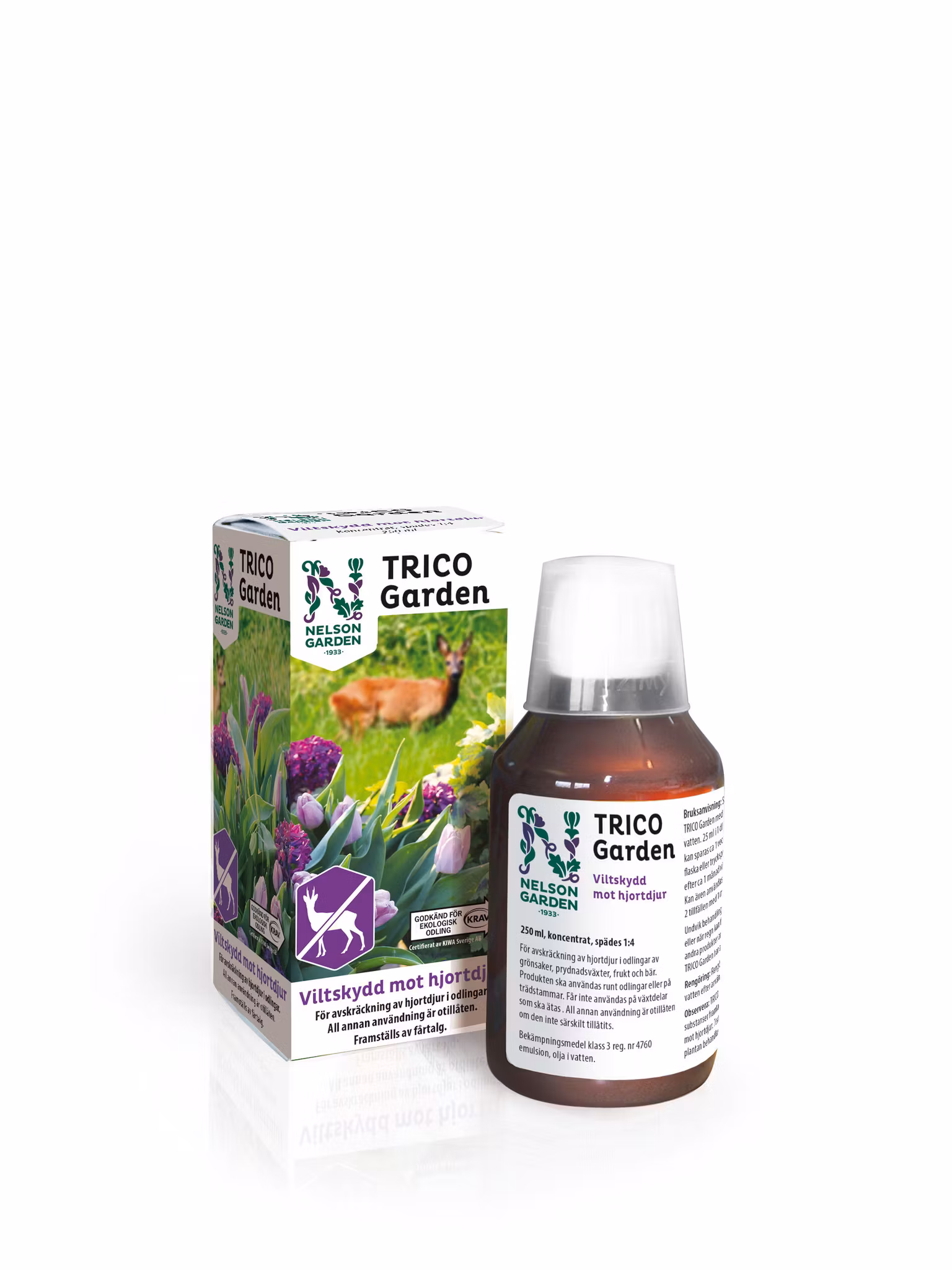 TRICO Garden är ett KRAV-godkänt medel framställt av fårtalg som med sin doft och smak avskräcker hjortdjur från odlingar av prydnadsväxter, grönsaker, frukt och bär. Medlet ger ett långvarigt skydd och kan användas året runt. TRICO Garden späds med vatten enligt rekommendationen på förpackningen och används runt odlingar eller på trädstammar, inte på växtdelar som ska ätas. Undvik behandling i solsken eller när plantan är våt samt i regn eller när regn kan förväntas. TRICO Garden har testats med den rekommenderade dosen på ett stort antal prydnadsväxter utan att skador har uppstått. Testa dock gärna på en del av växten innan hela plantan behandlas. Använd växtskyddsmedel med försiktighet. Läs alltid etiketten och produktinformation före användning.