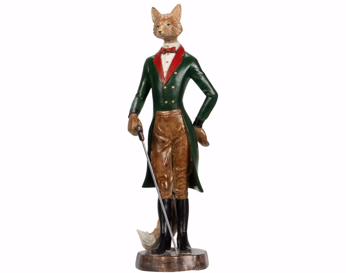 Räv Perry är klädd i en elegant frack och håller en stilfull promenadkäpp, vilket ger figuren ett uttryck av både klass och lekfullhet. De noggrant utformade detaljerna och harmoniska färgerna i svart och brunt gör att den passar lika bra i moderna som klassiska hem.