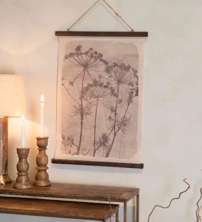 Motivet med fröstänglar för tankarna till naturen och ger en rogivande atmosfär i rummet. Väggbonaden är tillverkad i textil med inslag av trä, vilket ger en varm och levande känsla samt en dekorativ helhet på väggen .