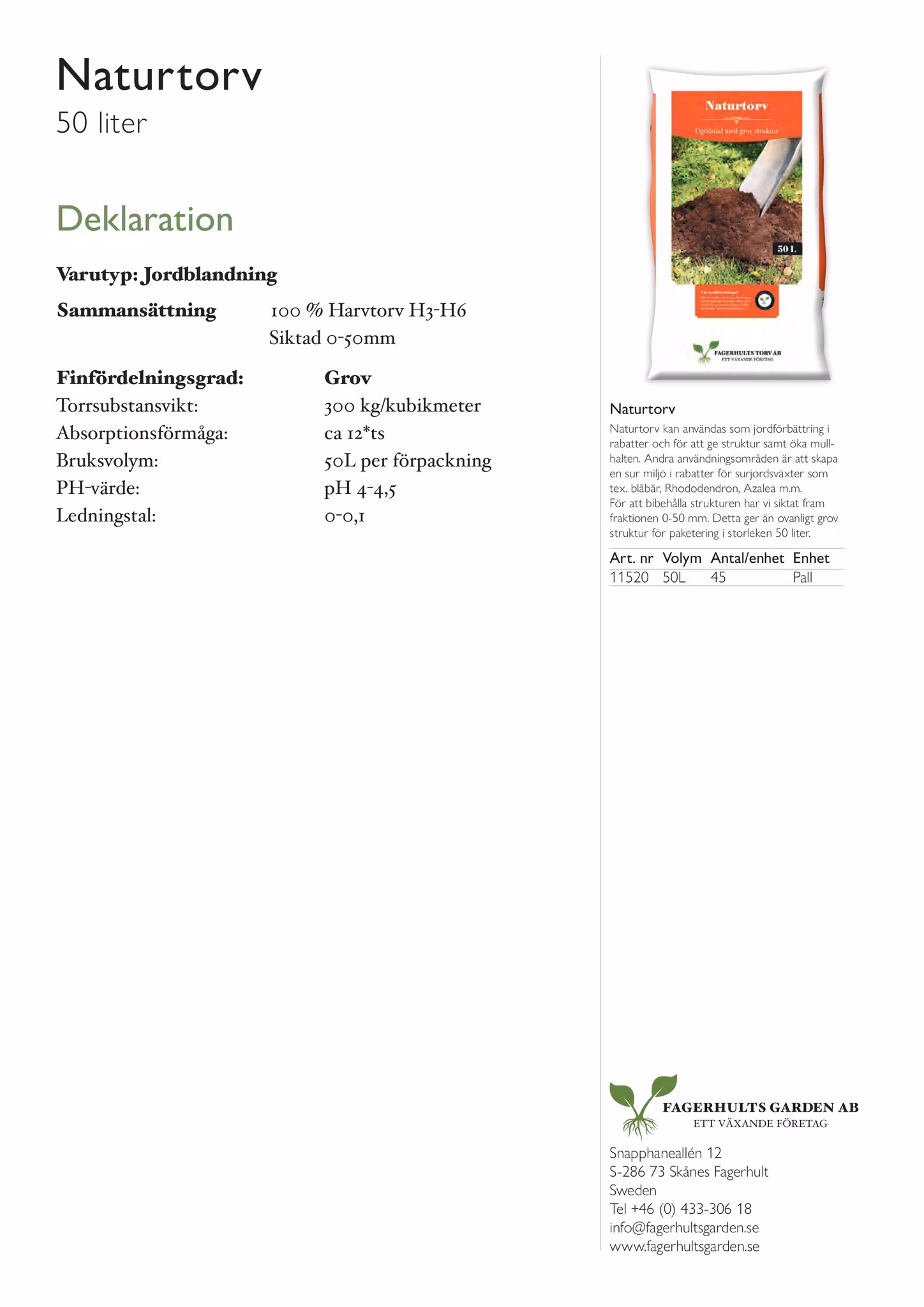 Naturtorv kan användas som jordförbättring i rabatter och för att ge struktur samt mull. Andra användningsområden är att skapa en sur miljö i rabatter för surjordsväxter som tex. blåbär, Rhododendron, Azalea m.m. För att bibehålla strukturen har vi siktat fram fraktionen 0-50 mm. Detta ger än ovanligt grov struktur för paketering i storleken 50 liter.
