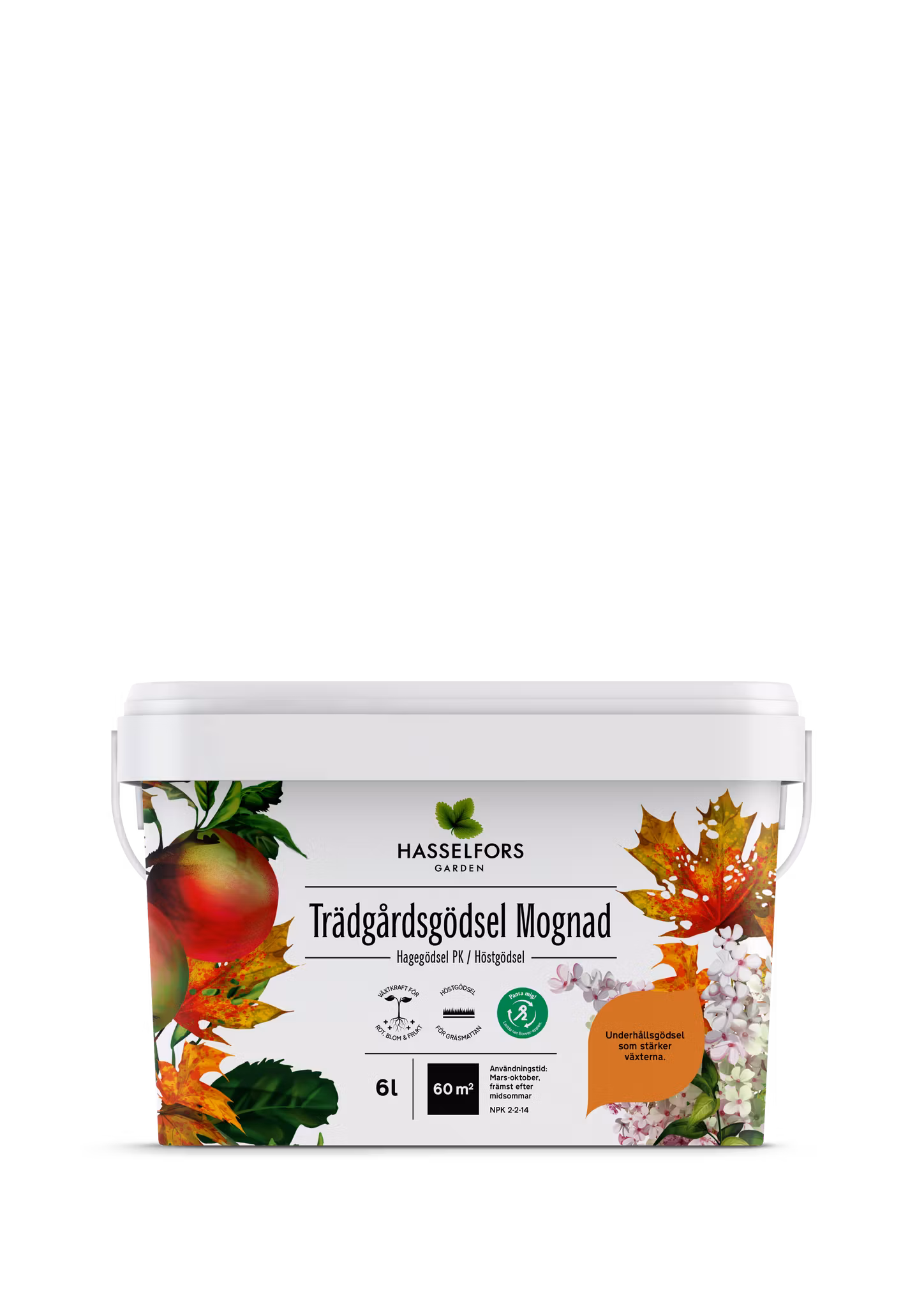 Trädgårdsgödsel Mognad är en mild underhållsgödsel för växterna, dig och jorden. Du kan tryggt använda den i hela trädgården. Använd gödseln främst efter midsommar och fram till hösten för ökad härdighet och förberedelse inför kommande säsong. Gödseln främjar avmogning och invintring hos gräsmattan, perenner, buskar och träd. Dessutom gynnas rottillväxten och bildningen av nästa säsongs blomknoppar. Skörden av både köksväxter, frukt och bär blir mer lagringstålig och får bättre smak.