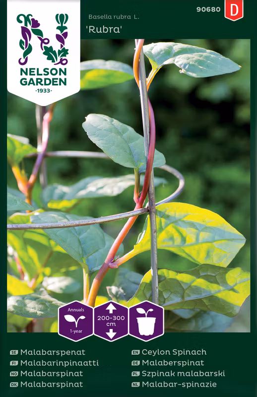 Klättrande bladgrönsak som är vacker och dekorativ med sina röda stjälkar och mörkt gröna blad. Så ett frö/kruka och låt gro i 25°C. Plocka blad efter hand eller skörda hela plantan när den är drygt en meter hög. Spara då ca 20 cm av stammen och några bladveck så växer den upp igen. Fin i matlagning, både bladen och stjälkarna kan användas likt spenat. Även god i gratänger och några blad i en gryta reder den. Kan ta tid på sig att gro.