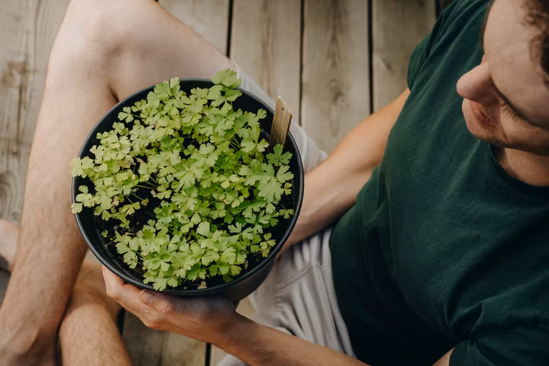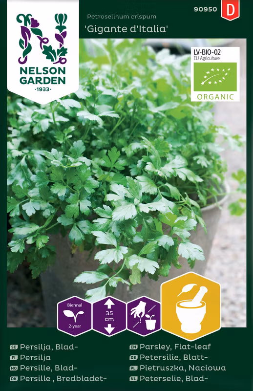 Ekologiskt frö. Persilja med släta blad som gör den mycket dekorativ. Skörda blad vid behov och långt in på hösten. Plantan övervintrar, åtminstone i södra delen av landet. Ger då tidig skörd år 2, innan den går i blom. Går bra att frysa. Trivs i en näringsrik och väldränerad jord. Vattna vid torka.